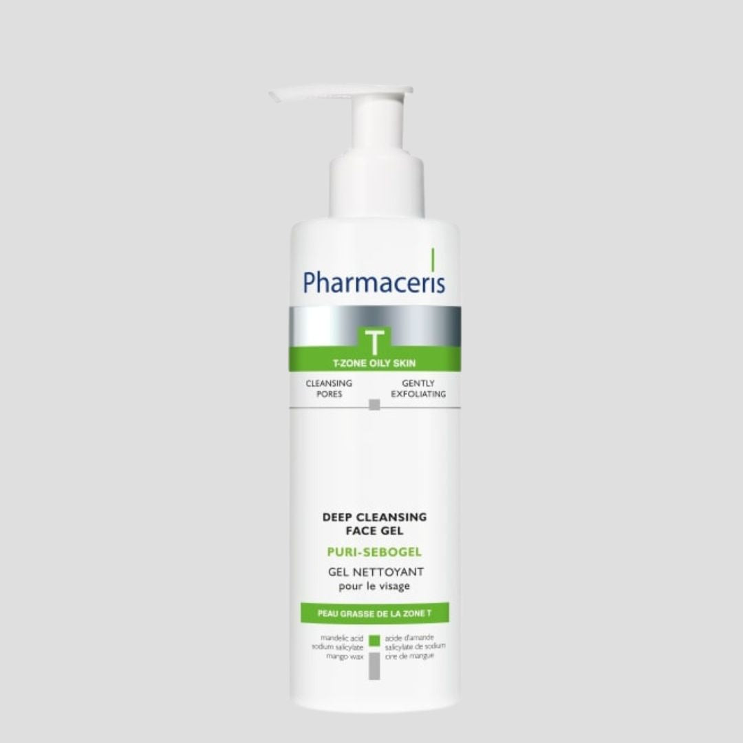 Pharmaceris T- Puri-Sebogel Cleansing Gel : A cleanser for daily use, designed for oily and combination skin prone to acne. It effectively cleanses the skin, reduces the appearance of blackheads, and serves as a suitable alternative to traditional soap. It purifies the skin from impurities and excess oil effectively without causing irritation or dryness. It maintains the proper balance of beneficial bacteria on the skin, and thanks to its antibacterial properties, it cleanses acne-prone skin from harmful bacteria. It contains salicylic acid, which gently exfoliates dead skin cells and reduces the spread of acne. Benefits of Pharmaceris T- Puri-Sebogel Cleansing Gel : Deeply cleanses the skin, removing makeup and impurities. Reduces sebum secretion and controls skin shine. Exfoliates dead skin cells. Features of PPharmaceris T- Puri-Sebogel Cleansing Gel : Suitable for oily